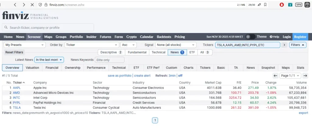 Самый быстрый и точный способ в 2025 году — колонка «News» прямо в гэп-сканере Finviz.