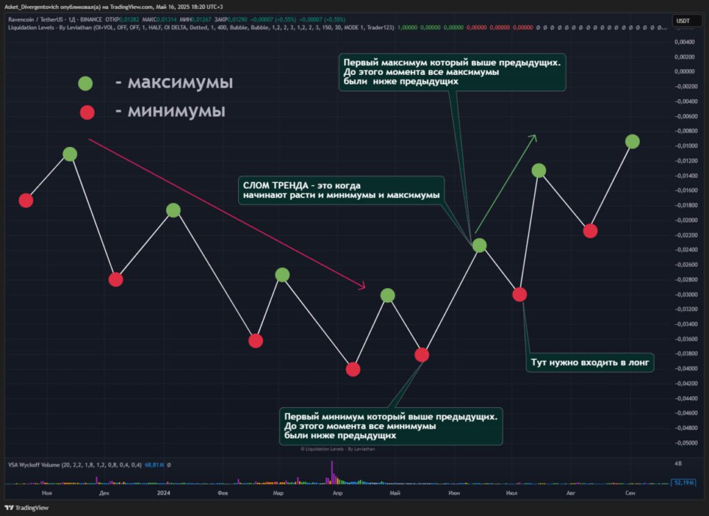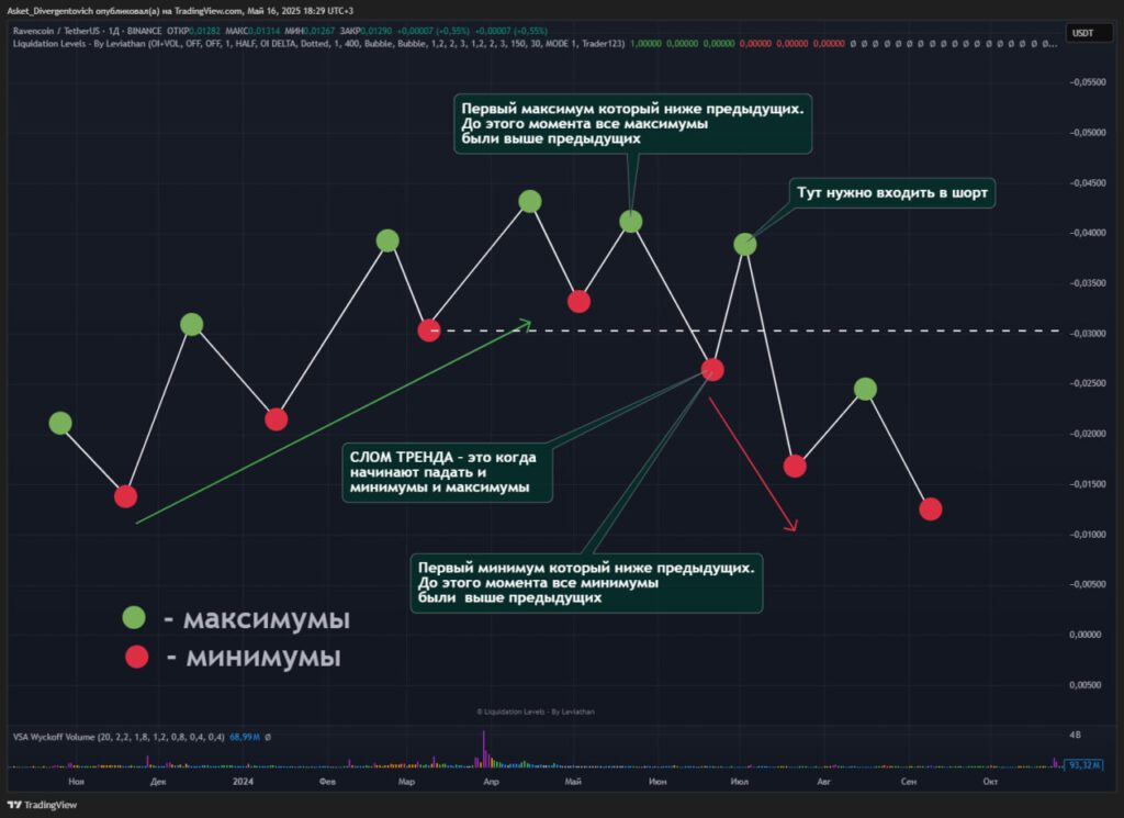 Слом тренда происходит, когда текущий тренд теряет силу, и рынок меняет направление. Например, восходящий тренд может смениться нисходящим или боковым. Это не просто краткосрочное колебание цены, а значительное изменение рыночной динамики.