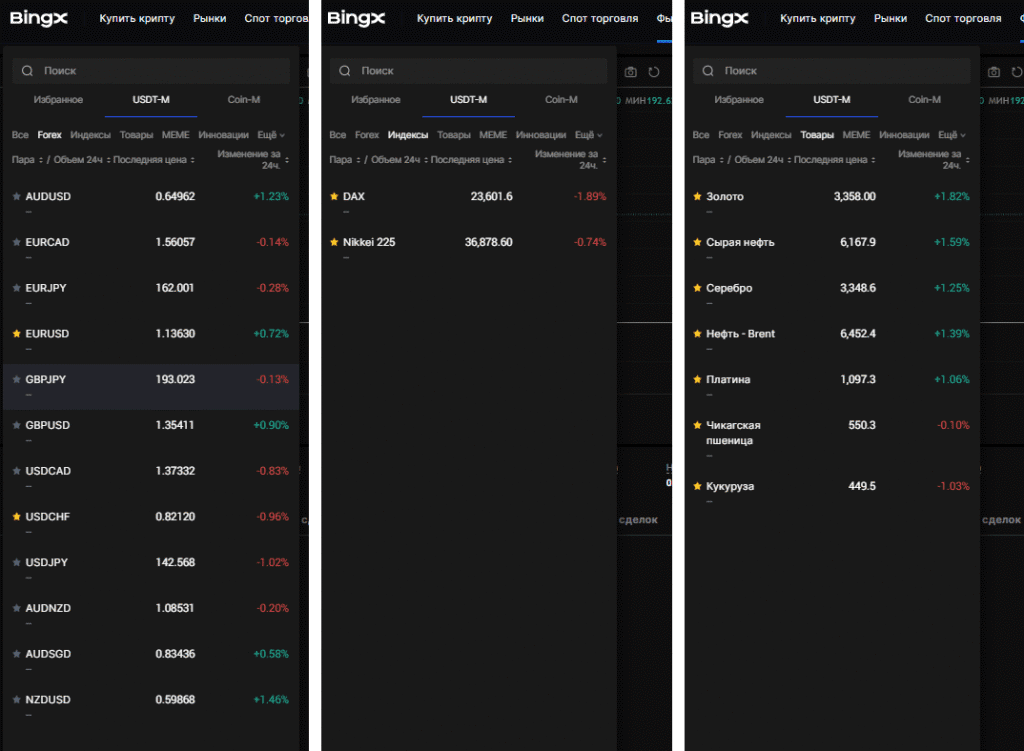 | BingX | EUR/USD, USD/JPY, GBP/USD, USD/CHF, AUD/CAD, AUD/CHF, EUR/GBP, AUD/NZD, USD/CAD, CAD/JPY, NZD/USD | XAU/USD (золото), XAG/USD (серебро), USOIL (нефть WTI), UKOIL (нефть Brent), Платина, Чикагская пшеница, Кукуруза, индексы (DAX, Nikkei 225) | Широкий выбор пар, поддержка CFD, интеграция с TradingView. |